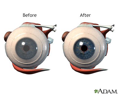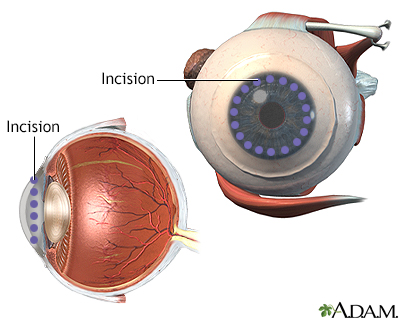 BACK TOTOP Browse A-ZSearchBrowse A-ZABCDEFGHIJKLMNOPQRSTUVWXYZ0-9 E-mail FormEmail ResultsName:Email address:Recipients Name:Recipients address:Message: Print-FriendlyBookmarksbookmarks-menuCorneal transplantKeratoplasty; Penetrating keratoplasty; Lamellar keratoplasty; Keratoconus - corneal transplant; Fuchs' dystrophy - corneal transplantThe cornea is the clear outer lens on the front of the eye. A corneal transplant is surgery to replace the cornea with tissue from a donor. It is one of the most common transplants done. Description You will most likely be awake during the transplant. You will get medicine to relax you. Local anesthesia (numbing medicine) will be injected around your eye to block pain and prevent eye movement during the surgery. The tissue for your corneal transplant will come from a person (donor) who has recently died. The donated cornea is processed and tested by a local eye bank to make sure it is safe for use in your surgery.For years, the most common type of corneal transplant was called penetrating keratoplasty.It is still a frequently performed operation. During this procedure, your surgeon will remove a small round piece of your cornea. The donated tissue will then be sewn into the opening of your cornea.A newer technique is called lamellar keratoplasty. In this procedure, only the inner or outer layers of the cornea are replaced, rather than all the layers, as in penetrating keratoplasty. There are several different lamellar techniques. They differ mostly on which layer is replaced and how the donor tissue is prepared. All lamellar procedures lead to faster recovery and fewer complications. Why the Procedure Is Performed A corneal transplant is recommended for people who have:Vision problems caused by thinning of the cornea, most often due to keratoconus. (A transplant may be considered when less invasive treatments are not an option.) KeratoconusKeratoconus is an eye disease that affects the structure of the cornea. The cornea is the clear tissue that covers the front of the eye. With this c...ImageRead Article Now Book Mark Article Scarring of the cornea from severe infections or injuries Vision loss caused by cloudiness of the cornea, most often due to Fuchs dystrophyFuchs dystrophyFuchs (pronounced "fooks") dystrophy is an eye disease in which cells lining the inner surface of the cornea slowly start to die off. The disease mo...ImageRead Article Now Book Mark Article Risks The body may reject the transplanted tissue. This occurs in about 1 out of 3 patients in the first 5 years. Rejection can sometimes be controlled with steroid eye drops. There have rare cases of graft rejection reported soon after COVID-19 vaccination.Other risks for a corneal transplant are:Bleeding BleedingBleeding is the loss of blood. Bleeding may be:Inside the body (internal)Outside the body (external)Bleeding may occur:Inside the body when blood le...ImageRead Article Now Book Mark Article Cataracts CataractsA cataract is a clouding of the lens of the eye.ImageRead Article Now Book Mark Article Infection of the eye Glaucoma (high pressure in the eye that can cause vision loss) GlaucomaGlaucoma is a group of eye conditions that can damage the optic nerve. This nerve sends the images you see to your brain. Most often, optic nerve da...ImageRead Article Now Book Mark Article Loss of vision Scarring of the eye Swelling of the cornea Before the Procedure Tell your surgeon and health care provider about any medical conditions you may have, including allergies. Also tell your provider what medicines you are taking, even medicines, supplements, and herbs you bought without a prescription.You may need to limit medicines that make it hard for your blood to clot (blood thinners) for 10 days before the surgery. Some of these are aspirin, ibuprofen (Advil, Motrin), and warfarin (Coumadin).Ask your surgeon which of your other daily medicines, such as water pills, insulin or pills for diabetes, you should take on the morning of your surgery.You will need to stop eating and drinking most fluids after midnight the night before your surgery. Most surgeons will let you have water, apple juice, and plain coffee or tea (without cream or sugar) up to 2 hours before surgery. Do not drink alcohol 24 hours before or after surgery.On the day of your surgery, wear loose, comfortable clothing. Do not wear any jewelry. Do not put creams, lotions, or makeup on your face or around your eyes.You will need to have someone drive you home after your surgery.Note: These are general guidelines. Your surgeon may give you other instructions. After the Procedure You will go home on the same day as your surgery. Your surgeon will give you an eye patch to wear for about 1 to 4 days.Your surgeon will prescribe eye drops to help your eye heal and prevent infection and rejection.Your surgeon will remove the stitches at a follow-up visit. Some stitches may stay in place for as long as a year, or they might not be removed at all. Outlook (Prognosis) Full recovery of eyesight may take up to a year. This is because it takes time for the swelling to go down. Most people who have a successful corneal transplant will have good vision for many years. If you have other eye problems, you may still have vision loss from those conditions. You may need glasses or contact lenses to achieve the best vision. Laser vision correction may be an option if you have nearsightedness, farsightedness, or astigmatism after the transplant has fully healed.Open ReferencesReferencesCioffi GA, Liebmann JM. Diseases of the visual system. In: Goldman L, Cooney KA, eds. Goldman-Cecil Medicine. 27th ed. Philadelphia, PA: Elsevier; 2024:chap 391.Gómez-Benlloch A,, Montesel A, Pareja-Aricò L, et al. Causes of corneal transplant failure: a multicentric study. Acta Ophthalmol. 2021;99(6):e922-e928. PMID: 33421330 pubmed.ncbi.nlm.nih.gov/33421330/.Hagem AM, Thorsrud A, Sæthre M, Sandvik G, Kristianslund O, Drolsum L. Dramatic reduction in corneal transplants