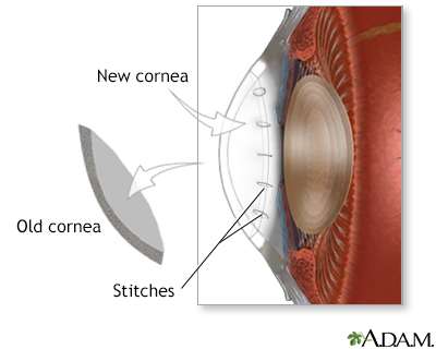 Corneal transplantKeratoplasty; Penetrating keratoplasty; Lamellar keratoplasty; Keratoconus - corneal transplant; Fuchs' dystrophy - corneal transplantThe cornea is the clear outer lens on the front of the eye. A corneal transplant is surgery to replace the cornea with tissue from a donor. It is one of the most common transplants done. Description You will most likely be awake during the transplant. You will get medicine to relax you. Local anesthesia (numbing medicine) will be injected around your eye to block pain and prevent eye movement during the surgery. The tissue for your corneal transplant will come from a person (donor) who has recently died. The donated cornea is processed and tested by a local eye bank to make sure it is safe for use in your surgery.For years, the most common type of corneal transplant was called penetrating keratoplasty.It is still a frequently performed operation. During this procedure, your surgeon will remove a small round piece of your cornea. The donated tissue will then be sewn into the opening of your cornea.A newer technique is called lamellar keratoplasty. In this procedure, only the inner or outer layers of the cornea are replaced, rather than all the layers, as in penetrating keratoplasty. There are several different lamellar techniques. They differ mostly on which layer is replaced and how the donor tissue is prepared. All lamellar procedures lead to faster recovery and fewer complications. Why the Procedure Is Performed A corneal transplant is recommended for people who have:Vision problems caused by thinning of the cornea, most often due to keratoconus. (A transplant may be considered when less invasive treatments are not an option.) KeratoconusKeratoconus is an eye disease that affects the structure of the cornea. The cornea is the clear tissue that covers the front of the eye. With this c...ImageRead Article Now Book Mark Article Scarring of the cornea from severe infections or injuries Vision loss caused by cloudiness of the cornea, most often due to Fuchs dystrophyFuchs dystrophyFuchs (pronounced "fooks") dystrophy is an eye disease in which cells lining the inner surface of the cornea slowly start to die off. The disease mo...ImageRead Article Now Book Mark Article Risks The body may reject the transplanted tissue. This occurs in about 1 out of 3 patients in the first 5 years. Rejection can sometimes be controlled with steroid eye drops. There have rare cases of graft rejection reported soon after COVID-19 vaccination.Other risks for a corneal transplant are:Bleeding BleedingBleeding is the loss of blood. Bleeding may be:Inside the body (internal)Outside the body (external)Bleeding may occur:Inside the body when blood le...ImageRead Article Now Book Mark Article Cataracts CataractsA cataract is a clouding of the lens of the eye.ImageRead Article Now Book Mark Article Infection of the eye Glaucoma (high pressure in the eye that can cause vision loss) GlaucomaGlaucoma is a group of eye conditions that can damage the optic nerve. This nerve sends the images you see to your brain. Most often, optic nerve da...ImageRead Article Now Book Mark Article Loss of vision Scarring of the eye Swelling of the cornea Before the Procedure Tell your surgeon and health care provider about any medical conditions you may have, including allergies. Also tell your provider what medicines you are taking, even medicines, supplements, and herbs you bought without a prescription.You may need to limit medicines that make it hard for your blood to clot (blood thinners) for 10 days before the surgery. Some of these are aspirin, ibuprofen (Advil, Motrin), and warfarin (Coumadin).Ask your surgeon which of your other daily medicines, such as water pills, insulin or pills for diabetes, you should take on the morning of your surgery.You will need to stop eating and drinking most fluids after midnight the night before your surgery. Most surgeons will let you have water, apple juice, and plain coffee or tea (without cream or sugar) up to 2 hours before surgery. Do not drink alcohol 24 hours before or after surgery.On the day of your surgery, wear loose, comfortable clothing. Do not wear any jewelry. Do not put creams, lotions, or makeup on your face or around your eyes.You will need to have someone drive you home after your surgery.Note: These are general guidelines. Your surgeon may give you other instructions. After the Procedure You will go home on the same day as your surgery. Your surgeon will give you an eye patch to wear for about 1 to 4 days.Your surgeon will prescribe eye drops to help your eye heal and prevent infection and rejection.Your surgeon will remove the stitches at a follow-up visit. Some stitches may stay in place for as long as a year, or they might not be removed at all. Outlook (Prognosis) Full recovery of eyesight may take up to a year. This is because it takes time for the swelling to go down. Most people who have a successful corneal transplant will have good vision for many years. If you have other eye problems, you may still have vision loss from those conditions. You may need glasses or contact lenses to achieve the best vision. Laser vision correction may be an option if you have nearsightedness, farsightedness, or astigmatism after the transplant has fully healed.Open ReferencesReferencesCioffi GA, Liebmann JM. Diseases of the visual system. In: Goldman L, Cooney KA, eds. Goldman-Cecil Medicine. 27th ed. Philadelphia, PA: Elsevier; 2024:chap 391.Gómez-Benlloch A,, Montesel A, Pareja-Aricò L, et al. Causes of corneal transplant failure: a multicentric study. Acta Ophthalmol. 2021;99(6):e922-e928. PMID: 33421330 pubmed.ncbi.nlm.nih.gov/33421330/.Hagem AM, Thorsrud A, Sæthre M, Sandvik G, Kristianslund O, Drolsum L. Dramatic reduction in corneal transplants for keratoconus 15 Years after the introduction of corneal collagen crosslinking. Cornea. 2024;43(4):437-442. PMID: 37851565 pubmed.ncbi.nlm.nih.gov/37851565/.McTiernan CD, Simpson FC, Haagd