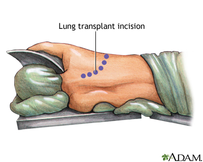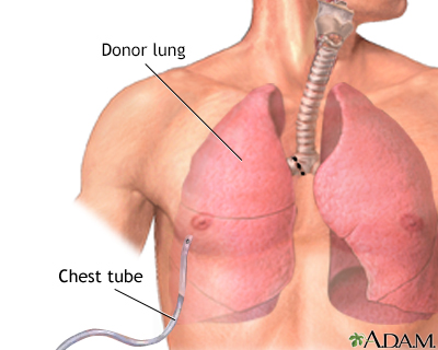 Lung transplantSolid organ transplant - lungLung transplant is surgery to replace one or both diseased lungs with healthy lungs from a human donor. Description In most cases, the new lung or lungs are donated by a person who is under age 65 and brain-dead, but is still on life-support. The donor lungs must be disease-free and matched as closely as possible to your tissue type. This reduces the chance that the body will reject the transplant.TransplantTransplantation is a procedure that is done to replace one of your organs with a healthy one from another person. The surgery is only one part of a ...Read Article Now Book Mark Article Lungs can also be given by living donors. Two or more people are needed. Each person donates a segment (lobe) of their lung. This forms an entire lung for the person who is receiving it. During lung transplant surgery, you are asleep and pain-free (under general anesthesia). A surgical cut is made in the chest. Lung transplant surgery is often done with the use of a heart-lung machine. This device does the work of your heart and lungs while your heart and lungs are stopped for the surgery. General anesthesiaGeneral anesthesia is treatment with certain medicines that puts you into a deep sleep-like state so you do not feel pain during surgery. After you ...Read Article Now Book Mark Article For single lung transplants, the cut is made on the side of your chest where the lung will be transplanted. The operation takes 4 to 8 hours. In most cases, the lung with the worst function is removed. For double lung transplants, the cut is made below the breast and reaches to both sides of the chest. Surgery takes 6 to 12 hours. After the cut is made, the major steps during lung transplant surgery include:You are placed on the heart-lung machine. One or both of your lungs are removed. For people who are having a double lung transplant, most or all of the steps from the first side are completed before the second side is done. The main blood vessels and airway of the new lung are sewn to your blood vessels and airway. The donor lobe or lung is stitched (sutured) into place. Chest tubes are inserted to drain air, fluid, and blood out of the chest for several days to allow the lungs to fully re-expand. You are taken off the heart-lung machine once the lungs are sewn in and working.Sometimes, heart and lung transplants are done at the same time (heart-lung transplant) if the heart is also diseased. Why the Procedure Is Performed In most cases, a lung transplant is done only after all other treatments for lung failure are unsuccessful. Lung transplants may be recommended for people under age 65 who have severe lung disease. Some examples of diseases that may require a lung transplant are:Cystic fibrosis Cystic fibrosisCystic fibrosis is a disease that causes thick, sticky mucus to build up in the lungs, digestive tract, and other areas of the body. It is one of th...ImageRead Article Now Book Mark Article Damage to the arteries of the lung because of a defect in the heart at birth (congenital defect) Defect in the heart at birth (congenita...Congenital heart disease (CHD) is a problem with the heart's structure and function that is present at birth.ImageRead Article Now Book Mark Article Destruction of the large airways and lung (bronchiectasis) BronchiectasisBronchiectasis is a disease in which the large airways in the lungs are damaged. This causes the airways to become permanently wider. Bronchiectasis...ImageRead Article Now Book Mark Article Emphysema or chronic obstructive pulmonary disease (COPD) Chronic obstructive pulmonary disease (...Chronic obstructive pulmonary disease (COPD) is a common lung disease. Having COPD makes it hard to breathe. There are two main forms of COPD:Chroni...ImageRead Article Now Book Mark Article Lung conditions in which the lung tissues become swollen and scarred (interstitial lung disease) Interstitial lung diseaseInterstitial lung disease (ILD) is a group of lung disorders in which the lung tissues become inflamed and then damaged.ImageRead Article Now Book Mark Article High blood pressure in the arteries of the lungs (pulmonary hypertension) Pulmonary hypertensionPulmonary hypertension is high blood pressure in the pulmonary arteries of the lungs. It makes the right side of the heart work harder than normal....ImageRead Article Now Book Mark Article SarcoidosisSarcoidosisSarcoidosis is a disease in which inflammation occurs in the lymph nodes, lungs, liver, eyes, skin, and/or other tissues.ImageRead Article Now Book Mark Article Lung transplant may not be done for people who: Are too sick or badly nourished to go through the procedure Badly nourishedMalnutrition is the condition that occurs when your body does not get enough nutrients.ImageRead Article Now Book Mark Article Continue to smoke or abuse alcohol or other drugs Have active hepatitis B, hepatitis C, or HIV HepatitisHepatitis is swelling and inflammation of the liver.ImageRead Article Now Book Mark Article HIVHuman immunodeficiency virus (HIV) is the virus that causes acquired immunodeficiency syndrome (AIDS). When a person becomes infected with HIV, the ...ImageRead Article Now Book Mark Article Have had cancer within the past 2 years Have lung disease that will likely affect the new lung Lung diseaseLung disease is any problem in the lungs that prevents the lungs from working properly. There are three main types of lung disease:Airway diseases -...ImageRead Article Now Book Mark Article Have severe disease of other organs Cannot reliably take their medicines Are unable to keep up with the hospital and health care visits and tests that are needed Risks Risks of lung transplant include: Blood clots (deep venous thrombosis). Deep venous thrombosisDeep vein thrombosis (DVT) is a condition that occurs when a blood clot forms in a vein deep inside a part of the body. DVT mainly affects the large...ImageRead Article Now Book Mark Article Diabetes, bone thinning, or high cholesterol l
