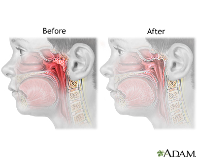 Adenoid removalAdenoidectomy; Removal of adenoid glandsAdenoid removal is surgery to take out the adenoid glands. The adenoid glands sit behind your nose above the roof of your mouth in the nasopharynx. Air passes over these glands when you take a breath.Previous imagePlay SlideshowStop SlideshowNext image / The adenoids are often taken out at the same time as the tonsils (tonsillectomy).TonsillectomyTonsillectomy is a surgery to remove the tonsils. The tonsils are glands at the back of your throat. The tonsils are often removed along with the ad...ImageRead Article Now Book Mark Article Adenoid removal is also called adenoidectomy. The procedure is most often done in children. Description Related video goes here for no-HTML5 browsersYour child will be given general anesthesia before surgery. This means your child will be asleep and unable to feel pain.During surgery:The surgeon places a small tool into your child's mouth to keep it open. The surgeon removes the adenoid glands using a spoon-shaped tool (curette). Or, another tool that helps cut away soft tissue is used. Some surgeons use electricity to heat the tissue, remove it, and stop bleeding. This is called electrocautery. Another method uses radiofrequency (RF) energy to do the same thing. This is called coblation. A cutting tool called a microdebrider can also be used to remove the adenoid tissue. Absorbent material called packing material may also be used to control bleeding. Your child will stay in the recovery room after surgery. You will be allowed to take your child home when your child is awake and can breathe easily, cough, and swallow. In most cases, this will be a few hours after surgery. Why the Procedure Is Performed A health care provider may recommend this procedure if: Enlarged adenoids are blocking your child's airway. Symptoms in your child can include heavy snoring, problems breathing through the nose, and episodes of not breathing during sleep. Enlarged adenoidsThe adenoids are lymph tissues that sit in your upper airway between your nose and the back of your throat. They are similar to the tonsils. Enlarge...ImageRead Article Now Book Mark Article Your child has chronic ear infections that occur often, continue despite use of antibiotics, cause hearing loss, or cause your child to miss a lot of school days. Adenoidectomy may also be recommended if your child has tonsillitis that keeps coming back.The adenoids normally shrink as children grow older. Adults rarely need to have them removed. Risks Risks of any anesthesia are:Reactions to medicines Breathing problemsBreathing problemsBreathing difficulty may involve:Difficult breathing Uncomfortable breathingFeeling like you are not getting enough airImageRead Article Now Book Mark Article Risks of any surgery are:Bleeding BleedingBleeding is the loss of blood. Bleeding may be:Inside the body (internal)Outside the body (external)Bleeding may occur:Inside the body when blood le...ImageRead Article Now Book Mark Article Infection Before the Procedure Related video goes here for no-HTML5 browsersYour provider will tell you how to prepare your child for this procedure. A week before the surgery, do not give your child any medicine that thins the blood unless your surgeon says to do so. Such medicines include aspirin and ibuprofen (Advil, Motrin).The night before the surgery, your child should have nothing to eat or drink after midnight. This includes water.You will be told what medicines your child should take on the day of surgery. Have your child take the medicine with a sip of water. After the Procedure Your child will go home on the same day as surgery. Complete recovery takes about 1 to 2 weeks.Follow instructions on how to care for your child at home.Care for your child at homeYour child had surgery to remove the tonsil and adenoid glands in the throat. These glands are located in the back of the throat and in the upper ai...ImageRead Article Now Book Mark Article Related video goes here for no-HTML5 browsers Outlook (Prognosis) After this procedure, most children:Breathe better through the nose Have fewer and milder sore throats Have fewer ear infections In rare cases, adenoid tissue may grow back. This does not cause problems most of the time. However, it can be removed again if necessary.Open ReferencesReferencesSchilder AGM, Rosenfeld RM, Venekamp RP. Acute otitis media and otitis media with effusion. In: Flint PW, Francis HW, Haughey BH, et al, eds. Cummings Otolaryngology: Head and Neck Surgery. 7th ed. Philadelphia, PA: Elsevier; 2021:chap 199.Told TN. Tonsillectomy and adenoidectomy. In: Fowler GC, ed. Pfenninger and Fowler's Procedures for Primary Care. 4th ed. Philadelphia, PA: Elsevier; 2020:chap 66.Zur KB. Tonsils and adenoids. In: Kliegman RM, St. Geme JW, Blum NJ, et al, eds. Nelson Textbook of Pediatrics. 22nd ed. Philadelphia, PA: Elsevier; 2025:chap 431.