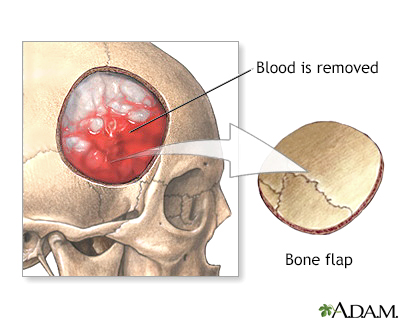 Brain surgeryCraniotomy; Surgery - brain; Neurosurgery; Craniectomy; Stereotactic craniotomy; Stereotactic brain biopsy; Endoscopic craniotomyBrain surgery is an operation to treat problems in the brain and surrounding structures. Description You may be awake or asleep during this procedure which is called a craniotomy. An awake craniotomy is done when your surgeon works near critical areas of your brain, such as the language area.Before surgery, the hair on part of the scalp is shaved and the skin is cleaned. The surgeon makes a cut through the scalp to expose the bone (skull). The location of this cut depends on where the problem in the brain is located.The surgeon uses a high-speed drill and saw to cut a portion of the bone (a bone flap) to access the brain.In some cases, the surgeon may create a smaller incision and use a tube equipped with a light and camera, known as an endoscope. The surgery is done by inserting tools through the endoscope. A computerized navigation system that generates 3D images from an MRI or CT scan of your brain helps the surgeon locate the specific area to be operated on.MRIA head MRI (magnetic resonance imaging) is an imaging test that uses powerful magnets and radio waves to create pictures of the brain and surrounding...ImageRead Article Now Book Mark Article CTA computed tomography (CT) scan is an imaging method that uses x-rays to create pictures of cross-sections of the body. Related tests include:Abdomin...ImageRead Article Now Book Mark Article During surgery, your surgeon may:Clip off an aneurysm to prevent bleeding AneurysmAn aneurysm is a weak area in the wall of a blood vessel that causes the blood vessel to bulge or balloon out. When an aneurysm occurs in a blood ve...ImageRead Article Now Book Mark Article Remove abnormal blood vessels Remove a tumor or a piece of tumor for a biopsy TumorA primary brain tumor is a group (mass) of abnormal cells that start in the brain.ImageRead Article Now Book Mark Article BiopsyA biopsy is the removal of a small piece of tissue for lab examination.ImageRead Article Now Book Mark Article Remove abnormal brain tissue Drain blood or an infection Free a nerve Take a sample of brain tissue to help diagnose nervous system diseases Put a tube (shunt) in the cavities of your brain to remove excess fluidThe bone flap is usually placed back at the end of the surgery, using small titanium plates to hold it in place. These plates are MRI compatible. This brain surgery is called a craniotomy.If a smaller hole (burr hole) was made, your surgeon may cover it with a metal plate.The bone flap may not be put back if your surgery involved a tumor or an infection, or if the brain was swollen. This brain surgery is called a craniectomy. The bone flap may be kept in a freezer or placed under the skin of your abdomen and put back during a future operation.The time it takes for the surgery depends on the problem being treated. Why the Procedure Is Performed Brain surgery may be done if you have:Brain tumor Bleeding (hemorrhage) in the brain Blood clots (hematomas) in the brain Blood clotsBlood clots are clumps that occur when blood hardens from a liquid to a solid. A blood clot that forms inside one of your veins or arteries is calle...ImageRead Article Now Book Mark Article Weaknesses in blood vessels (brain aneurysm repair) Brain aneurysm repairBrain aneurysm repair is surgery to correct an aneurysm in or near the brain. This is a weak area in a blood vessel wall that causes the vessel to b...Read Article Now Book Mark Article Abnormal blood vessels in the brain (arteriovenous malformations [AVMs], cavernous malformation) Damage to tissues covering the brain (dura) Infections in the brain (brain abscesses) Brain abscessesA brain abscess is a collection of pus, immune cells, and other material in the brain, caused by a bacterial or fungal infection.ImageRead Article Now Book Mark Article Severe nerve or face pain (such as trigeminal neuralgia, or tic douloureux) Trigeminal neuralgiaTrigeminal neuralgia (TN) is a nerve disorder. It causes a stabbing or electric shock-like pain in parts of the face.ImageRead Article Now Book Mark Article Skull fracture Pressure in the brain after an injury or stroke StrokeA stroke occurs when blood flow to a part of the brain stops. A stroke is sometimes called a "brain attack. " If blood flow is cut off for longer th...ImageRead Article Now Book Mark Article Epilepsy EpilepsyEpilepsy is a brain disorder in which a person has repeated seizures over time. Seizures are episodes of uncontrolled and abnormal electrical activi...ImageRead Article Now Book Mark Article Certain brain diseases (such as Parkinson disease) that may be helped with an implanted electronic device Parkinson diseaseParkinson disease results from certain brain cells dying. These cells help control movement and coordination. The disease leads to shaking (tremors...ImageRead Article Now Book Mark Article Excess cerebrospinal fluid in the cavities of your brain (hydrocephalus)HydrocephalusHydrocephalus is a buildup of fluid inside the skull that leads to the brain pushing against the skull. Hydrocephalus means "water on the brain. "...ImageRead Article Now Book Mark Article Risks Risks for anesthesia and surgery in general are:Reactions to medicines Problems breathing Bleeding, blood clots, infection Possible risks of brain surgery are:Problems with speech, memory, muscle weakness, balance, vision, coordination, and other functions. These problems may last a short while or they may not go away. Blood clot or bleeding in the brain. Seizures. SeizuresA seizure is the physical changes in behavior that occurs during an episode of specific types of abnormal electrical activity in the brain. The term ...ImageRead Article Now Book Mark Article Stroke. Coma. ComaDecreased alertness is a state of reduced awareness and is often a serious condition. A coma is the most severe state of decreased alertness in which...Read Article Now Book Mark Artic