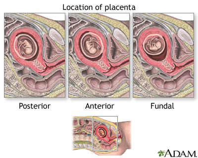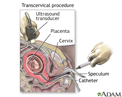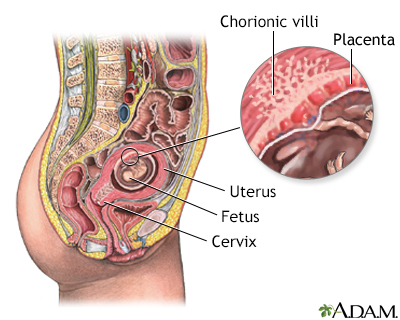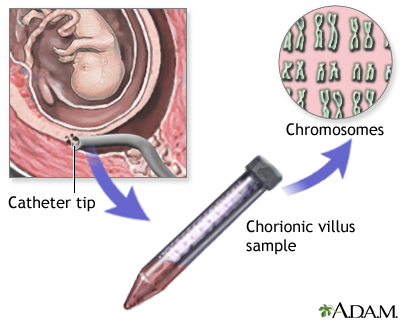 Chorionic villus samplingCVS; Pregnancy - CVS; Genetic counseling - CVSChorionic villus sampling (CVS) is a test some pregnant women have to screen their baby for genetic problems. How the Test is Performed CVS can be done through the cervix (transcervical) or through the belly (transabdominal). Miscarriage rates are slightly higher when the test is done through the cervix.MiscarriageA miscarriage is the spontaneous loss of a fetus before the 20th week of pregnancy. Pregnancy losses after the 20th week are called stillbirths. Mi...ImageRead Article Now Book Mark Article The transcervical procedure is performed by inserting a thin plastic tube through the vagina and cervix to reach the placenta. Your health care provider uses ultrasound images to help guide the tube into the best area for sampling. A small sample of chorionic villus (placental) tissue is then removed.The transabdominal procedure is performed by inserting a needle through the abdomen and uterus and into the placenta. Ultrasound is used to help guide the needle, and a small amount of tissue is drawn into the syringe.The sample is placed in a dish and evaluated in a lab. The time to get a test result may vary, depending on the laboratory or the specific test ordered. Most results are available in 7 to 14 days. Preliminary results of the CVS may be available in as little 48 hours in situations where the information is needed more quickly. How to Prepare for the Test Your provider will explain the procedure, its risks, and alternative procedures such as amniocentesis.AmniocentesisAmniocentesis is a test that can be done during pregnancy to look for certain problems in the developing baby. These problems include:Birth defectsG...ImageRead Article Now Book Mark Article You will be asked to sign a consent form before this procedure. You may be asked to wear a hospital gown.The morning of the procedure, you may be asked to drink fluids and refrain from urinating. Doing so fills your bladder, which helps your provider see where to best guide the needle.Tell your provider if you are allergic to iodine or shellfish, or if you have any other allergies. How the Test will Feel The ultrasound does not hurt. A clear, water-based gel is applied to your skin to help with the transmission of the sound waves. A hand-held probe called a transducer is then moved over your belly area. In addition, your provider may apply pressure on your abdomen to find the position of your uterus.The gel will feel cold at first and may irritate your skin if not washed off after the procedure.Some women say the vaginal approach feels like a Pap test with some discomfort and a feeling of pressure. There may be a small amount of vaginal bleeding following the procedure.Pap testThe Pap test mainly checks for changes in the cervix that may turn into cervical cancer. Cells scraped from the opening of the cervix are examined u...ImageRead Article Now Book Mark Article An obstetrician can perform this procedure in about 5 minutes, after preparation. Why the Test is Performed The test is used to identify any genetic problems in your unborn baby. It is very accurate, and it can be done very early in a pregnancy.Genetic problems can occur in any pregnancy. However, the following factors increase the risk:An older mother Past pregnancies with genetic problems Family history of genetic disordersGenetic counseling is recommended before the procedure. This will allow you to make an unhurried, informed decision about options for prenatal diagnosis.Genetic counselingGenetics is the study of heredity, the process of a parent passing certain genes on to their children. A person's appearance, such as height, hair co...ImageRead Article Now Book Mark Article CVS can be done sooner in pregnancy than amniocentesis, most often at about 10 to 12 weeks.CVS does not detect:Neural tube defects (these involve the spinal column or brain) Neural tube defectsTaking folic acid before and during pregnancy can reduce the risk for certain birth defects. These include spina bifida, anencephaly, and some heart...ImageRead Article Now Book Mark Article Rh incompatibility (this occurs when a pregnant woman has Rh-negative blood and her unborn baby has Rh-positive blood) Rh incompatibilityRh incompatibility is a condition that develops when a pregnant woman has Rh-negative blood and the baby in her womb has Rh-positive blood.ImageRead Article Now Book Mark Article Birth defects not due to a genetic cause Issues related to brain function, such as autism and intellectual disability Normal Results A normal result means there are no signs of genetic defects in the developing baby. Even though the test results are very accurate, no test is 100% accurate at testing for genetic problems in a pregnancy. What Abnormal Results Mean This test can help detect hundreds of genetic disorders. Abnormal results may be due to many different genetic conditions, including:Down syndrome Down syndromeDown syndrome is a genetic condition in which a person has 47 chromosomes instead of the usual 46.Read Article Now Book Mark Article Hemoglobinopathies HemoglobinopathiesHemoglobinopathy is a group of disorders in which there is abnormal production or structure of the hemoglobin molecule. It is passed down through fa...Read Article Now Book Mark Article Tay-Sachs diseaseTay-Sachs diseaseTay-Sachs disease is a life-threatening disease of the nervous system passed down through families.ImageRead Article Now Book Mark Article Talk to your provider about the meaning of your specific test results. Ask your provider:How the condition or defect may be treated either during or after the pregnancy What special needs your child may have after birth What other options you have about maintaining or ending your pregnancy Risks The risks of CVS are only slightly higher than those of amniocentesis.Possible complications include:Bleeding Infection Miscarriage (in up to 1 in 100 women) Rh incompatibility in the mother Rupture of membranes, whi