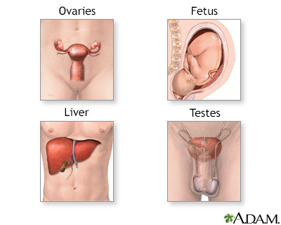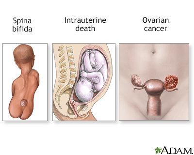 Alpha fetoproteinFetal alpha globulin; AFPAlpha fetoprotein (AFP) is a protein produced by the liver and yolk sac of a developing baby during pregnancy. AFP levels go down soon after birth. It is likely that AFP has no normal function in adults.A test can be done to measure the amount of AFP in your blood. How the Test is Performed A blood sample is needed. Most of the time, blood is typically drawn from a vein located on the inside of the elbow or the back of the hand. Drawn from a veinVenipuncture is the collection of blood from a vein. It is most often done for laboratory testing.ImageRead Article Now Book Mark Article How to Prepare for the Test You do not need to take any special steps to prepare. How the Test will Feel You may feel slight pain or a sting when the needle is inserted. You may also feel some throbbing at the site after the blood is drawn. Why the Test is Performed Your health care provider may order this test to:Screen for problems in the baby during pregnancy. (The test is done as part of a larger set of blood tests called quadruple screen.) Quadruple screenThe quadruple screen test is a blood test done during pregnancy to determine whether the baby is at risk for certain birth defects.ImageRead Article Now Book Mark Article Diagnose certain liver disorders. Screen for and monitor some cancers. Normal Results The normal values in males or nonpregnant females is generally less than 40 micrograms/liter.The examples above are common measurements for results of these tests. Normal value ranges may vary slightly among different laboratories. Some labs use different measurements or test different samples. Talk to your provider about the meaning of your specific test results. What Abnormal Results Mean Greater than normal levels of AFP may be due to:Cancer in testes, ovaries, biliary (liver secretion) tract, stomach, or pancreas CancerCancer is the uncontrolled growth of abnormal cells in the body. Cancerous cells are also called malignant cells.ImageRead Article Now Book Mark Article TestesThe testes are 2 egg-shaped male reproductive organs located in the scrotum. They produce sperm and the male hormone, testosterone.ImageRead Article Now Book Mark Article Cirrhosis of the liver Cirrhosis of the liverCirrhosis is scarring of the liver and poor liver function. It is the last stage of chronic liver disease.ImageRead Article Now Book Mark Article Liver cancer Liver cancerHepatocellular carcinoma is cancer that starts in the liver.ImageRead Article Now Book Mark Article Malignant teratoma Malignant teratomaA teratoma is a type of tumor that contains one or more of the three layers of cells found in a developing baby (embryo). These cells are called ger...ImageRead Article Now Book Mark Article Recovery from hepatitis Recovery from hepatitisHepatitis is swelling and inflammation of the liver.ImageRead Article Now Book Mark Article Problems during pregnancyOpen ReferencesReferencesDriscoll DA, Simpson JL. Genetic screening and diagnosis. In: Landon MB, Galan HL, Jauniaux ERM, et al, eds. Gabbe's Obstetrics: Normal and Problem Pregnancies. 8th ed. Philadelphia, PA: Elsevier; 2021:chap 10.Dugoff L, Wapner RJ. Prenatal diagnosis of congenital disorders. In: Lockwood CJ, Copel JA, Dugoff L et al, eds. Creasy and Resnik's Maternal-Fetal Medicine: Principles and Practice. 9th ed. Philadelphia, PA: Elsevier; 2023:chap 30.Lee E. Neonatology. In: Anderson CC, Kapoor S, Mark TE, eds. The Harriet Lane Handbook. 23rd ed. Philadelphia, PA: Elsevier; 2024:chap 18.Lee P, Jain S, Pincus MR, et al. Diagnosis and management of cancer using serologic and other body fluid markers. In: McPherson RA, Pincus MR, eds. Henry's Clinical Diagnosis and Management by Laboratory Methods. 24th ed. Philadelphia, PA: Elsevier; 2022:chap 76.