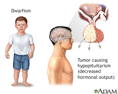 Growth hormone testGH testThe growth hormone test measures the amount of growth hormone in the blood.The pituitary gland makes growth hormone, which causes a child to grow. This gland is located at the base of the brain. How the Test is Performed A blood sample is needed. Blood sampleVenipuncture is the collection of blood from a vein. It is most often done for laboratory testing.ImageRead Article Now Book Mark Article How to Prepare for the Test Your health care provider may give you special instructions about what you can or cannot eat before the test. How the Test will Feel When the needle is inserted to draw blood, some people feel moderate pain. Others feel only a prick or stinging. Afterward, there may be some throbbing or a slight bruise. This soon goes away. Why the Test is Performed This hormone may be checked if a person's growth pattern is abnormal or if another condition is suspected. Too much growth hormone (GH) can cause abnormally increased growth patterns. In adults, this is called acromegaly. In children, it is called gigantism. AcromegalyAcromegaly is a condition in which there is too much growth hormone (GH) in your body.ImageRead Article Now Book Mark Article GigantismGigantism is abnormal growth due to an excess of growth hormone (GH) during childhood.ImageRead Article Now Book Mark Article Too little growth hormone can cause a slow or flat rate of growth in children. In adults, it can sometimes cause changes in energy, muscle mass, cholesterol levels, and bone strength. Too little growth hormoneGrowth hormone deficiency means the pituitary gland does not make enough growth hormone.ImageRead Article Now Book Mark Article The GH test may also be used to monitor response to acromegaly treatment. Normal Results The normal range for GH level is typically:For adult males -- 0.05 to 3 nanograms per milliliter (ng/mL) For adult females -- 0.05 to 8 ng/mL For children -- varies with age and sex, ask your provider what is normal for your childGH is released in pulses. The size and duration of the pulses varies with time of day, age, and sex. This is why random GH measurements are rarely useful. A higher level may be normal if the blood was drawn during a pulse. A lower level may be normal if the blood was drawn around the end of a pulse. GH is most useful when measured as part of a stimulation or suppression test.Normal value ranges may vary slightly among different laboratories. Some labs use different measurements or test different specimens. Talk to your provider about the meaning of your specific test results. What Abnormal Results Mean A high level of GH may indicate:Acromegaly in adults. (A special test is done to confirm this diagnosis.) Special testThe growth hormone suppression test determines whether growth hormone (GH) production can be suppressed by taking a specific amount of glucose (calle...ImageRead Article Now Book Mark Article Gigantism in children. This is abnormal growth due to excess GH. (A special test is done to confirm this diagnosis.) Special testThe growth hormone suppression test determines whether growth hormone (GH) production can be suppressed by taking a specific amount of glucose (calle...ImageRead Article Now Book Mark Article GH resistance. Pituitary tumor. Pituitary tumorA pituitary tumor is an abnormal growth in the pituitary gland. The pituitary is a small gland at the base of the brain. It regulates the body's ba...ImageRead Article Now Book Mark Article A low level of GH may indicate:Slow growth noticed in infancy or childhood. (A special test is done to confirm this diagnosis.) Special testThe growth hormone (GH) stimulation test measures the ability of the body to produce GH.ImageRead Article Now Book Mark Article Hypopituitarism (low function of the pituitary gland). The pituitary gland makes several hormones besides GH and these may be low as well.HypopituitarismHypopituitarism is a condition in which the pituitary gland does not produce normal amounts of some or all of its hormones.ImageRead Article Now Book Mark Article Risks There is little risk involved with having your blood taken. Veins and arteries vary in size from one person to another, and from one side of the body to the other. Obtaining a blood sample from some people may be more difficult than from others.Other risks associated with having blood drawn are slight, but may include:Excessive bleeding Fainting or feeling lightheaded Multiple punctures to locate veins Hematoma (blood buildup under the skin) HematomaA bruise is an area of skin discoloration. A bruise occurs when small blood vessels break and leak their contents into the soft tissue beneath the s...ImageRead Article Now Book Mark Article Infection (a slight risk any time the skin is broken)Open ReferencesReferencesAli O. Hyperpituitarism, tall stature, and overgrowth syndromes. In: Kliegman RM, St. Geme JW, Blum NJ, Shah SS, Tasker RC, Wilson KM, eds. Nelson Textbook of Pediatrics. 21st ed. Philadelphia, PA: Elsevier; 2020:chap 576.Cooke DW, Divall SA, Radovick S. Normal and aberrant growth in children. In: Melmed S, Auchus RJ, Goldfine AB, Koenig RJ, Rosen CJ, eds. Williams Textbook of Endocrinology. 14th ed. Philadelphia, PA: Elsevier; 2020:chap 25.Weiss RE. Anterior pituitary. In: Goldman L, Cooney KA, eds. Goldman-Cecil Medicine. 27th ed. Philadelphia, PA: Elsevier; 2024:chap 205.