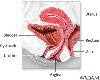 Anterior vaginal wall repairVaginal wall repair; Colporrhaphy - repair of vaginal wall; Cystocele repair - vaginal wall repairAnterior vaginal wall repair is a surgical procedure. This surgery tightens the front (anterior) wall of the vagina.AnteriorAnterior means "in front of" or "the front surface of. " It usually refers to the front side of the body. For example, your knee caps are on the ant...ImageRead Article Now Book Mark Article Description The anterior vaginal wall can sink (prolapse) or bulge. This occurs when the bladder or the urethra sink into the vagina.The repair may be done while you are under:General anesthesia: You will be asleep and unable to feel pain. General anesthesiaGeneral anesthesia is treatment with certain medicines that puts you into a deep sleep-like state so you do not feel pain during surgery. After you ...Read Article Now Book Mark Article Spinal anesthesia: You will be awake, but you will be numb from the waist down and you will not feel pain. You will be given medicines to help you relax.Spinal anesthesiaSpinal and epidural anesthesia are procedures that deliver medicines that numb parts of your body to block pain. They are given through shots in or ...ImageRead Article Now Book Mark Article Your surgeon will:Make a surgical cut through the front wall of your vagina. VaginaThe vagina is the female body part that connects the womb (uterus) and cervix to the outside of the body.ImageRead Article Now Book Mark Article Move your bladder back to its normal location. May fold your vagina, or cut away part of it. Put sutures (stitches) in the tissue between your vagina and bladder. These will hold the walls of your vagina in the correct position. Place a patch between your bladder and vagina. This patch can be made of commercially available biological material (cadaveric tissue). The FDA has banned use of synthetic material and animal tissue in the vagina to treat anterior vaginal wall prolapse. Attach sutures to the walls of the vagina to the tissue on the side of your pelvis. Why the Procedure Is Performed This procedure is used to repair sinking or bulging of the anterior vaginal wall.Symptoms of anterior vaginal wall prolapse include:Anterior vaginal wall prolapseUterine prolapse occurs when the womb (uterus) drops down and presses into the vaginal area.ImageRead Article Now Book Mark Article You may not be able to empty your bladder completely. Your bladder may feel full all the time. You may feel pressure in your vagina. You may be able to feel or see a bulging at the opening of the vagina. You may have pain when you have sex. You may leak urine when you cough, sneeze, or lift something. You may get bladder infections. This surgery by itself does not treat stress incontinence. Stress incontinence is the leaking of urine when you cough, sneeze, or lift. Surgery to correct stress urinary incontinence may be performed along with other surgeries.Stress incontinenceStress urinary incontinence occurs when your bladder leaks urine during physical activity or exertion. It may happen when you cough, sneeze, lift so...ImageRead Article Now Book Mark Article Before doing this surgery, your health care provider may have you:Learn pelvic floor muscle exercises (Kegel exercises) Kegel exercisesKegel exercises can help make the pelvic floor muscles under the uterus, bladder, and bowel (large intestine) stronger. They can help both men and w...Read Article Now Book Mark Article Use estrogen cream in your vagina Try a device called a pessary in your vagina to strengthen the muscle around the vagina Risks Risks for anesthesia and surgery in general are:Reactions to medicines Breathing problems Bleeding, blood clots InfectionRisks for this procedure include:Damage to the urethra, bladder, or vagina Irritable bladder Changes in the vagina (prolapsed vagina) Urine leakage from the vagina or to the skin (fistula) Worsening urinary incontinence Urinary incontinenceUrinary (or bladder) incontinence occurs when you are not able to keep urine from leaking out of your urethra. The urethra is the tube that carries ...ImageRead Article Now Book Mark Article Lasting pain Complications from the material used during surgery (mesh/grafts) Before the Procedure Always tell your surgeon what medicines you are taking. Also tell them about the medicines, supplements, or herbs you bought without a prescription that you are taking.During the days before the surgery:You may be asked to stop taking aspirin, ibuprofen (Advil, Motrin), warfarin (Coumadin), and any other medicines that make it hard for your blood to clot. Ask your surgeon which medicines you should still take on the day of your surgery. On the day of your surgery:You very often will be asked not to drink or eat anything for 6 to 12 hours before the surgery. Take the medicines your surgeon told you to take with a small sip of water. Your surgeon will tell you when to arrive at the hospital. After the Procedure You may have a catheter to drain urine for 1 or 2 days after surgery. You can start eating normal food soon after the surgery.CatheterA urinary catheter is a tube placed in the body to drain and collect urine from the bladder.ImageRead Article Now Book Mark Article When your normal bowel function returns, you can return to your regular diet.You should not insert anything in the vagina, lift heavy items, or have sex until your surgeon says it is OK. Outlook (Prognosis) This surgery will very often repair the prolapse and the symptoms will go away. This improvement will often last for years.Open ReferencesReferencesKirby AC, Lentz GM. Pelvic organ prolapse, abdominal hernias, and inguinal hernias: diagnosis and management. In: Gershenson DM, Lentz GM, Valea FA, Lobo RA, eds. Comprehensive Gynecology. 8th ed. Philadelphia, PA: Elsevier; 2022:chap 20.Winters JC, Krlin RM, Hallner B. Vaginal and abdominal reconstructive surgery for pelvic organ prolapse. In: Partin AW, Dmochowski RR, Kavoussi LR, Peters CA, eds. Campbell-Walsh-Wein