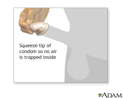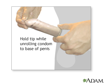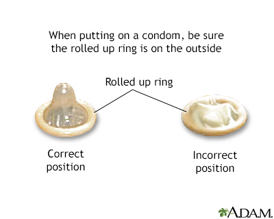 Condoms - maleProphylactics; Rubbers; Male condoms; Contraceptive - condom; Contraception - condom; Barrier method - condomA condom is a thin cover worn on the penis during intercourse. Using a condom will help prevent:Female partners from becoming pregnant. Getting an infection spread through sexual contact, or from giving one to your partner. These infections include herpes, chlamydia, gonorrhea, HIV, and warts.ChlamydiaChlamydia is an infection caused by the bacteria Chlamydia trachomatis. It is most often spread through sexual contact.ImageRead Article Now Book Mark Article GonorrheaGonorrhea is a common sexually transmitted infection (STI).Read Article Now Book Mark Article Condoms for women can also be purchased.Condoms for womenThe female condom is a device used for birth control. Like a male condom, it creates a barrier to prevent the sperm from getting to the egg....ImageRead Article Now Book Mark Article Information The male condom is a thin cover that fits over a man's erect penis. Condoms are made of:PenisThe penis is the male organ used for urination and sexual intercourse. The penis is located above the scrotum. It is made of spongy tissue and bloo...ImageRead Article Now Book Mark Article Animal skin (This type does not protect against the spread of infections.) Latex rubber Polyurethane Condoms are the only method of birth control for men that are not permanent. They can be purchased at most drugstores, in vending machines in some restrooms, by mail order, and at certain health care clinics. Condoms do not cost very much.HOW DOES A CONDOM WORK TO PREVENT PREGNANCY?If the sperm contained in a male's semen reach a woman's vagina, pregnancy may occur. Condoms work by preventing sperm from coming in contact with the inside of the vagina. If condoms are used correctly every time intercourse occurs, the risk of pregnancy is around 3 out of every 100 times. However, there is a higher chance of pregnancy if a condom:Is not used correctly during sexual contact Breaks or tears during use Condoms do not work as well at preventing pregnancy as some other forms of birth control. However, using a condom is much better than not using birth control at all. Some condoms contain substances that kill sperm, called a spermicide. These may work slightly better to prevent pregnancy. A condom also prevents the spread of certain viruses and bacteria that cause diseases. Herpes may still be spread if there is contact between the penis and the groin area outside of the vagina. Condoms do not fully protect you from the spread of warts. HOW TO USE A MALE CONDOMThe condom must be put on before the penis comes into contact with the outside of the vagina or enters the vagina. If not:The fluids that come out of the penis before climax carry sperm and may cause pregnancy. Infections can be spread. The condom must be put on when the penis is erect, but before contact is made between the penis and vagina. Be careful not to tear or poke a hole in it while opening the package and removing the condom. If the condom has a little tip (receptacle) on the end of it (to collect semen), place the condom against the top of the penis and carefully roll the sides down the shaft of the penis. If there is no tip, be sure to leave a little space between the condom and the end of the penis. Otherwise, the semen may push up the sides of the condom and come out at the bottom before the penis and condom are pulled out. Be sure there is not any air between the penis and the condom. This can cause the condom to break. Some people find it helpful to unroll the condom a little before putting it on the penis. This leaves plenty of room for semen to collect. It also prevents the condom from being stretched too tightly over the penis. After semen is released during climax, remove the condom from the vagina. The best way is to grasp the condom at the base of the penis and hold it as the penis is pulled out. Avoid having any semen spill into the vagina. IMPORTANT TIPSMake sure you have condoms around when you need them. If no condoms are handy, you may be tempted to have intercourse without one. Use each condom only once.Store condoms in a cool, dry place away from sunlight and heat.Do not carry condoms in your wallet for long periods of time. Replace them every once in a while. Wear and tear can create tiny holes in the condom. But, it is still better to use a condom that has been in your wallet for a long time than to not use one at all. Do not use a condom that is brittle, sticky, or discolored. These are signs of age, and old condoms are more likely to break. Do not use a condom if the package is damaged. The condom may be damaged as well. Do not use a lubricant with a petroleum base, such as Vaseline. These substances break down latex, the material in some condoms. If you feel a condom break during intercourse, stop right away and put on a new one. If semen is released into the vagina when a condom breaks:Insert a spermicidal foam or jelly to help reduce the risk of pregnancy or passing an STD. Contact your health care provider or pharmacy about emergency contraception ("morning-after pills"). Emergency contraceptionEmergency contraception is a birth control method to prevent pregnancy in women. It can be used:After a sexual assault or rapeWhen a condom breaks o...ImageRead Article Now Book Mark Article PROBLEMS WITH CONDOM USESome complaints or problems with condom use include:Allergic reactions to latex condoms are rare, but can occur. (Changing to condoms made of polyurethane or animal membranes may help.) Friction of the condom may cut down on sexual enjoyment. (Lubricated condoms may reduce this problem.) Intercourse also may be less pleasurable because the man must pull out his penis right after ejaculation. Placing a condom may interrupt sexual activity. The woman is not aware of warm fluid entering her body (important to some women, not to others). Open ReferencesReferencesCenters for Disease Control and Prevention websi