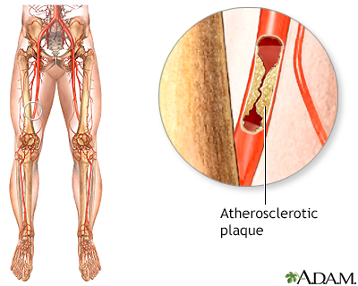 Peripheral artery bypass - legAortobifemoral bypass; Femoropopliteal; Femoral popliteal; Aorta-bifemoral bypass; Axillo-bifemoral bypass; Ilio-bifemoral bypass; Femoral-femoral bypass; Distal leg bypassPeripheral artery bypass is surgery to reroute the blood supply around a blocked artery, most often in one of your legs. Fatty deposits can build up inside the arteries and block them.Blocked artery, most often in one of yo...Peripheral artery disease (PAD) is a condition of the blood vessels that supply the legs and feet. It occurs due to narrowing of the arteries in the...ImageRead Article Now Book Mark Article A graft is used to replace or bypass the blocked part of the artery. The graft may be a plastic tube, or it may be a blood vessel (vein) taken from your body (most often the opposite leg) during the same surgery. Description Peripheral artery bypass surgery can be done in one or more of the following blood vessels:Aorta (the main artery that comes from your heart) Artery in your hip Artery in your thigh Artery behind your knee Artery in your lower leg Artery in your armpitDuring bypass surgery of any artery:You will receive medicine (anesthesia) so that you do not feel pain. The kind of anesthesia you receive will depend on what artery is being treated. Your surgeon will make a cut over the part of the artery that is blocked. After moving skin and tissue out of the way, the surgeon will place clamps at each end of the blocked section of artery. The graft is then sewn in place. The surgeon will make sure you have good blood flow in your extremity. Then your cut will be closed. You may have an x-ray called an arteriogram to make sure that the graft is working.ArteriogramAn arteriogram is an imaging test that uses x-rays and a special dye to see inside the arteries. It can be used to view arteries in the heart, brain...ImageRead Article Now Book Mark Article If you are having bypass surgery to treat your aorta and iliac artery or your aorta and both femoral arteries (aortobifemoral):You will probably have general anesthesia. This will make you unconscious and unable to feel pain. Or, you may have epidural or spinal anesthesia instead. The anesthesia doctor will inject your spine with medicine to make you numb from your waist down. General anesthesiaGeneral anesthesia is treatment with certain medicines that puts you into a deep sleep-like state so you do not feel pain during surgery. After you ...Read Article Now Book Mark Article Your surgeon will make a surgical cut in the middle of the abdomen to reach the aorta and iliac arteries.If you are having bypass surgery to treat your lower leg (femoral popliteal):You may have general anesthesia. You will be unconscious and unable to feel pain. You may instead have an epidural or spinal anesthesia. The anesthesia doctor will inject your spine with medicine to make you numb from your waist down. Some people have local anesthesia and a medicine to relax them. Local anesthesia numbs just the area being worked on. Your surgeon will make a cut in your leg between your groin and knee. It will be near the blockage in your artery. Why the Procedure Is Performed Symptoms of a blocked peripheral artery are pain, achiness, or heaviness in your leg that starts or gets worse when you walk.You may not need bypass surgery if these problems happen only when you walk and then go away when you rest. You may not need this surgery if you can still do most of your everyday activities. Your health care provider can try medicines and other treatments first.Reasons for having arterial bypass surgery of the leg are:You have symptoms that keep you from doing your everyday tasks. Your symptoms do not get better with other treatment. You have skin ulcers (sores) or wounds on your leg that do not heal. You have an infection or gangrene in your leg. You have pain in your leg from your narrowed arteries, even when you are resting or at night. Before having surgery, your surgeon will do special tests to see the extent of the blockage. Risks Risks for any anesthesia and surgery are:Allergic reactions to medicines Blood clots in the legs that may travel to the lungs Blood clotsBlood clots are clumps that occur when blood hardens from a liquid to a solid. A blood clot that forms inside one of your veins or arteries is calle...ImageRead Article Now Book Mark Article Breathing problems Breathing problemsBreathing difficulty may involve:Difficult breathing Uncomfortable breathingFeeling like you are not getting enough airImageRead Article Now Book Mark Article Heart attack or strokeHeart attackMost heart attacks are caused by a blood clot that blocks one of the coronary arteries. The coronary arteries bring blood and oxygen to the heart. ...ImageRead Article Now Book Mark Article StrokeA stroke occurs when blood flow to a part of the brain stops. A stroke is sometimes called a "brain attack. " If blood flow is cut off for longer th...ImageRead Article Now Book Mark Article Risks for this surgery are:Bypass does not work Damage to a nerve that causes pain or numbness in your leg Damage to nearby organs in the body Damage to the bowel during aortic surgery Excess bleeding Infection in the surgical cut Injury to nearby nerves Sexual problems caused by damage to a nerve during aortofemoral or aortoiliac bypass surgery Surgical cut that opens up Need for a second bypass surgery or a leg amputation Leg amputationLeg or foot amputation is the removal of a leg, foot or toes from the body. These body parts are called extremities. Amputations are done either by...Read Article Now Book Mark Article Heart attack Death Before the Procedure You will have a physical exam and many medical tests. Most people need to get their heart and lungs checked before they have peripheral artery bypass.Tell your surgeon or nurse if:You are or could be pregnant. You are taking any medicines, including medicines, drugs, supplements, or herbs you bought without a prescription. You have been drinking a lot o