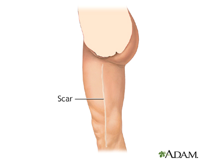 BACK TOTOP Browse A-ZSearchBrowse A-ZABCDEFGHIJKLMNOPQRSTUVWXYZ0-9 E-mail FormEmail ResultsName:Email address:Recipients Name:Recipients address:Message: Print-FriendlyBookmarksbookmarks-menuPeripheral artery bypass - legAortobifemoral bypass; Femoropopliteal; Femoral popliteal; Aorta-bifemoral bypass; Axillo-bifemoral bypass; Ilio-bifemoral bypass; Femoral-femoral bypass; Distal leg bypassPeripheral artery bypass is surgery to reroute the blood supply around a blocked artery, most often in one of your legs. Fatty deposits can build up inside the arteries and block them.Blocked artery, most often in one of yo...Peripheral artery disease (PAD) is a condition of the blood vessels that supply the legs and feet. It occurs due to narrowing of the arteries in the...ImageRead Article Now Book Mark Article A graft is used to replace or bypass the blocked part of the artery. The graft may be a plastic tube, or it may be a blood vessel (vein) taken from your body (most often the opposite leg) during the same surgery. Description Peripheral artery bypass surgery can be done in one or more of the following blood vessels:Aorta (the main artery that comes from your heart) Artery in your hip Artery in your thigh Artery behind your knee Artery in your lower leg Artery in your armpitDuring bypass surgery of any artery:You will receive medicine (anesthesia) so that you do not feel pain. The kind of anesthesia you receive will depend on what artery is being treated. Your surgeon will make a cut over the part of the artery that is blocked. After moving skin and tissue out of the way, the surgeon will place clamps at each end of the blocked section of artery. The graft is then sewn in place. The surgeon will make sure you have good blood flow in your extremity. Then your cut will be closed. You may have an x-ray called an arteriogram to make sure that the graft is working.ArteriogramAn arteriogram is an imaging test that uses x-rays and a special dye to see inside the arteries. It can be used to view arteries in the heart, brain...ImageRead Article Now Book Mark Article If you are having bypass surgery to treat your aorta and iliac artery or your aorta and both femoral arteries (aortobifemoral):You will probably have general anesthesia. This will make you unconscious and unable to feel pain. Or, you may have epidural or spinal anesthesia instead. The anesthesia doctor will inject your spine with medicine to make you numb from your waist down. General anesthesiaGeneral anesthesia is treatment with certain medicines that puts you into a deep sleep-like state so you do not feel pain during surgery. After you ...Read Article Now Book Mark Article Your surgeon will make a surgical cut in the middle of the abdomen to reach the aorta and iliac arteries.If you are having bypass surgery to treat your lower leg (femoral popliteal):You may have general anesthesia. You will be unconscious and unable to feel pain. You may instead have an epidural or spinal anesthesia. The anesthesia doctor will inject your spine with medicine to make you numb from your waist down. Some people have local anesthesia and a medicine to relax them. Local anesthesia numbs just the area being worked on. Your surgeon will make a cut in your leg between your groin and knee. It will be near the blockage in your artery. Why the Procedure Is Performed Symptoms of a blocked peripheral artery are pain, achiness, or heaviness in your leg that starts or gets worse when you walk.You may not need bypass surgery if these problems happen only when you walk and then go away when you rest. You may not need this surgery if you can still do most of your everyday activities. Your health care provider can try medicines and other treatments first.Reasons for having arterial bypass surgery of the leg are:You have symptoms that keep you from doing your everyday tasks. Your symptoms do not get better with other treatment. You have skin ulcers (sores) or wounds on your leg that do not heal. You have an infection or gangrene in your leg. You have pain in your leg from your narrowed arteries, even when you are resting or at night. Before having surgery, your surgeon will do special tests to see the extent of the blockage. Risks Risks for any anesthesia and surgery are:Allergic reactions to medicines Blood clots in the legs that may travel to the lungs Blood clotsBlood clots are clumps that occur when blood hardens from a liquid to a solid. A blood clot that forms inside one of your veins or arteries is calle...ImageRead Article Now Book Mark Article Breathing problems Breathing problemsBreathing difficulty may involve:Difficult breathing Uncomfortable breathingFeeling like you are not getting enough airImageRead Article Now Book Mark Article Heart attack or strokeHeart attackMost heart attacks are caused by a blood clot that blocks one of the coronary arteries. The coronary arteries bring blood and oxygen to the heart. ...ImageRead Article Now Book Mark Article StrokeA stroke occurs when blood flow to a part of the brain stops. A stroke is sometimes called a "brain attack. " If blood flow is cut off for longer th...ImageRead Article Now Book Mark Article Risks for this surgery are:Bypass does not work Damage to a nerve that causes pain or numbness in your leg Damage to nearby organs in the body Damage to the bowel during aortic surgery Excess bleeding Infection in the surgical cut Injury to nearby nerves Sexual problems caused by damage to a nerve during aortofemoral or aortoiliac bypass surgery Surgical cut that opens up Need for a second bypass surgery or a leg amputation Leg amputationLeg or foot amputation is the removal of a leg, foot or toes from the body. These body parts are called extremities. Amputations are done either by...Read Article Now Book Mark Article Heart attack Death Before the Procedure You will have a physical exam and many medical tests. Most people need to get their heart and lungs checked before they have peripheral artery bypass.Tell your surg
