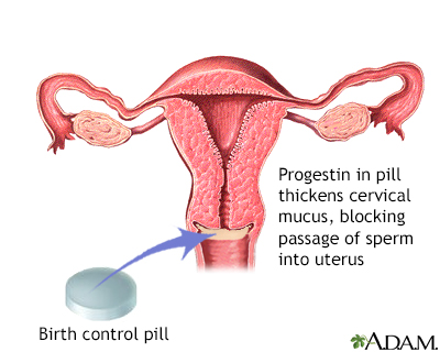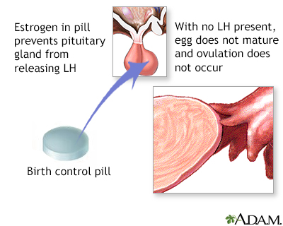 BACK TOTOP Browse A-ZSearchBrowse A-ZABCDEFGHIJKLMNOPQRSTUVWXYZ0-9 E-mail FormEmail ResultsName:Email address:Recipients Name:Recipients address:Message: Print-FriendlyBookmarksbookmarks-menuBirth control pillsContraception - pills - hormonal methods; Hormonal birth control methods; Birth control pills; Contraceptive pills; BCP; OCP; Family planning - BCP; Estrogen - BCP; Progestin - BCPBirth control pills (BCPs) contain man-made forms of 2 hormones called estrogen and progestin. These hormones are made naturally in a woman's ovaries. BCPs can contain both of these hormones, or have progestin only.Both hormones prevent a woman's ovary from releasing an egg during her menstrual cycle (called ovulation). They do this by changing the levels of the natural hormones the body makes.Progestins also make the mucus around a woman's cervix thick and sticky. This helps prevent sperm from entering the uterus. Information BCPs are also called oral contraceptives or just "the pill." A health care provider must prescribe most types of BCPs but one was recently approved by the US Food and Drug Administration for over-the-counter use.The most common type of BCP combines the hormones estrogen and progestin. There are many different forms of this type of pill. BCP combines the hormones estrogen and ...Oral contraceptives use hormones to prevent pregnancy. Combination pills contain both progestin and estrogen.Read Article Now Book Mark Article The "mini-pill" is a type of BCP that contains only progestin, no estrogen. These pills are an option for women who do not like the side effects of estrogen or who cannot take estrogen for medical reasons. They can also be used after delivery in women who are breastfeeding. All women who take BCPs need a check-up at least once a year. Women should also have their blood pressure checked 3 months after they begin to take the pill.BCPs only work well if the woman remembers to take her pill daily without missing a day. Only 2 or 3 women out of 100 who take BCPs correctly for a year will get pregnant.BCPs may cause many side effects. These include:Changes in menstrual cycles, no menstrual cycles, extra bleeding Nausea, mood changes, worsening of migraines (mostly due to estrogens) Breast tenderness and weight gain Rare but dangerous risks from taking BCPs include:Blood clots Heart attack High blood pressure Stroke BCPs without estrogen are much less likely to cause these problems. The risk is higher for women who smoke or have a history of high blood pressure, clotting disorders, or unhealthy cholesterol levels. However, the risks of developing these complications are much lower with either type of pill than with pregnancy.BCPs without estrogenOral contraceptives use hormones to prevent pregnancy. Progestin-only pills have only the hormone progestin. They do not have estrogen in them....Read Article Now Book Mark Article Regular menstrual cycles will return within 3 to 6 months after a woman stops using most hormonal birth control methods.Open ReferencesReferencesAllen RH, Huguenin A, Hickey M, Kaunitz AM. Hormonal contraception. In: Melmed S, Auchus RJ, Goldfine AB, Rosen CJ, Kopp PA, eds. Williams Textbook of Endocrinology. 15th ed. Philadelphia, PA: Elsevier; 2025:chap 16.American College of Obstetricians and Gynecologists website. ACOG Practice Bulletin No. 206: Use of hormonal contraception in women with coexisting medical conditions. Obstet Gynecol. 2019;133(6):1288. Erratum for: Obstet Gynecol. 2019;133(2):e128-e150. PMID: 31135757 pubmed.ncbi.nlm.nih.gov/31135757/.Harper DM, Wilfling LE, Blanner CF. Contraception. In: Rakel RE, Rakel DP, eds. Textbook of Family Medicine. 9th ed. Philadelphia, PA: Elsevier Saunders; 2016:chap 26.Rivlin K, Davis AR. Contraception and abortion. In: Gershenson DM, Lentz GM, Valea FA, Lobo RA, eds. Comprehensive Gynecology. 8th ed. Philadelphia, PA: Elsevier; 2022:chap 13.Winikoff B, Grossman D. Contraception. In: Goldman L, Cooney KA, eds. Goldman-Cecil Medicine. 27th ed. Philadelphia, PA: Elsevier; 2024:chap 220.AllVideoImagesTogBirth control pill - series - Normal female anatomyPresentation Hormone-based contraceptives - illustration The pill works in several ways to prevent pregnancy. The pill suppresses ovulation so that an egg is not released from the ovaries, and changes the cervical mucus, causing it to become thicker and making it more difficult for sperm to swim into the womb. The pill also does not allow the lining of the womb to develop enough to receive and nurture a fertilized egg. This method of birth control offers no protection against sexually-transmitted diseases.Hormone-based contraceptivesillustration Birth control pill - series - Normal female anatomyPresentation Hormone-based contraceptives - illustration The pill works in several ways to prevent pregnancy. The pill suppresses ovulation so that an egg is not released from the ovaries, and changes the cervical mucus, causing it to become thicker and making it more difficult for sperm to swim into the womb. The pill also does not allow the lining of the womb to develop enough to receive and nurture a fertilized egg. This method of birth control offers no protection against sexually-transmitted diseases.Hormone-based contraceptivesillustrationA Closer Look Birth control options for women - InDepth(In-Depth)Self Care Birth control pills - combinationBirth control pills - progestin onlyRelated Information Review Date: 3/31/2024 Reviewed By: LaQuita Martinez, MD, Department of Obstetrics and Gynecology, Emory Johns Creek Hospital, Alpharetta, GA. Also reviewed by David C. Dugdale, MD, Medical Director, Brenda Conaway, Editorial Director, and the A.D.A.M. Editorial team. The information provided herein should not be used during any medical emergency or for the diagnosis or treatment of any medical condition. A licensed medical professional should be consulted for diagnosis and treatment of any and all medical conditions. Links to other sites are provided for information 