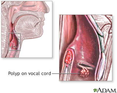 Laryngoscopy and nasolaryngoscopyLaryngopharyngoscopy; Indirect laryngoscopy; Flexible laryngoscopy; Mirror laryngoscopy; Direct laryngoscopy; Fiberoptic laryngoscopy; Laryngoscopy using strobe (laryngeal stroboscopy) Laryngoscopy is an exam of the back of your throat, including your voice box (larynx). Your voice box contains your vocal cords and allows you to speak. How the Test is Performed Laryngoscopy may be done in different ways:Indirect laryngoscopy uses a small mirror held at the back of your throat. Your health care provider shines a light on the mirror to view the throat area. This is a simple procedure. Most of the time, it can be done in your provider's office while you are awake. A medicine to numb the back of your throat may be used. Fiberoptic laryngoscopy (nasolaryngoscopy) uses a small flexible telescope. The scope is passed through your nose and into your throat. This is the most common way that the voice box is examined. You are awake for the procedure. Numbing medicine will be sprayed in your nose. This procedure typically takes less than 1 minute. Laryngoscopy using strobe light can also be done. Use of strobe light can give your provider more information about problems with your voice box. Direct laryngoscopy uses a tube called a laryngoscope. The instrument is placed in the back of your throat. The tube may be flexible or stiff. This procedure allows your provider to see deeper in the throat and to remove a foreign object or sample tissue for a biopsy. It is done in a hospital or medical center under general anesthesia, meaning you will be asleep and pain-free. How to Prepare for the Test Preparation will depend on the type of laryngoscopy you will have. If the exam will be done under general anesthesia, you may be told not to drink or eat anything for several hours before the test. How the Test will Feel How the test will feel depends on which type of laryngoscopy is done.Indirect laryngoscopy using a mirror or stroboscopy can cause gagging. For this reason, it is not often used in children under age 6 to 7 or those who gag easily.Fiberoptic laryngoscopy can be done in children. It may cause a feeling of pressure and a feeling like you are going to sneeze. Why the Test is Performed This test can help your provider diagnose many conditions involving the throat and voice box. Your provider may recommend this test if you have:Bad breath that does not go away Breathing problems, including noisy breathing (stridor) Long-term (chronic) cough Coughing up blood Difficulty swallowing Ear pain that does not go away Feeling that something is stuck in your throat Long-term upper respiratory problem in a smoker Mass in the head or neck area with signs of cancer Throat pain that does not go away Voice problems that last more than 3 weeks, including hoarseness, weak voice, raspy voice, or no voiceA direct laryngoscopy may also be used to:Remove a sample of tissue in the throat for closer examination under a microscope (biopsy) Remove an object that is blocking the airway (for example, a swallowed a marble or coin) Normal Results A normal result means the throat, voice box, and vocal cords appear normal. What Abnormal Results Mean Abnormal results may be due to:Acid reflux (GERD), which can cause redness and swelling of the vocal cords Acid reflux (GERD)Gastroesophageal reflux disease (GERD) is a condition in which the stomach contents leak backward from the stomach into the esophagus (food pipe). F...ImageRead Article Now Book Mark Article Cancer of the throat or voice box CancerCancer is the uncontrolled growth of abnormal cells in the body. Cancerous cells are also called malignant cells.ImageRead Article Now Book Mark Article Nodules on the vocal cords Polyps (benign lumps) on the voice box PolypsNasal polyps are soft, sac-like growths on the lining of the nose or sinuses.ImageRead Article Now Book Mark Article Inflammation in the throat Thinning of the muscle and tissue in the voice box (presbylaryngis) Risks Laryngoscopy is a safe procedure. Risks depend on the specific procedure, but may include:Allergic reaction to anesthesia, including breathing and heart problems Infection Major bleeding Nosebleed Spasm of the vocal cords, which causes breathing problems Ulcers in the lining of the mouth/throat Injury to the tongue or lips Considerations Indirect mirror laryngoscopy should NOT be done:In infants or very young children If you have acute epiglottitis, an infection or swelling of the flap of tissue in front of the voice box If you cannot open your mouth very wideOpen ReferencesReferencesArmstrong WB, Vokes DE, Tjoa T, Verma SP. Malignant tumors of the larynx. In: Flint PW, Francis HW, Haughey BH, et al, eds. Cummings Otolaryngology: Head and Neck Surgery. 7th ed. Philadelphia, PA: Elsevier; 2021:chap 105.Mark LJ, Hillel AT, Lester L, Akst SA, Cover R, Herzer K. General considerations of anesthesia and management of the difficult airway. In: Flint PW, Francis HW, Haughey BH, et al, eds. Cummings Otolaryngology: Head and Neck Surgery. 7th ed. Philadelphia, PA: Elsevier; 2021:chap 5.Sarber KM, Lam DJ, Ishman SL. Sleep apnea and sleep disorders. In: Flint PW, Francis HW, Haughey BH, et al, eds. Cummings Otolaryngology: Head and Neck Surgery. 7th ed. Philadelphia, PA: Elsevier; 2021:chap 15Sidell DR, Messner AH. Evaluation and management of the pediatric airway. In: Flint PW, Francis HW, Haughey BH, et al, eds. Cummings Otolaryngology: Head and Neck Surgery. 7th ed. Philadelphia, PA: Elsevier; 2021:chap 206.Syme NP, Hoffman HT, Anderson C, Pagedar NA. Management of early glottic cancer. In: Flint PW, Francis HW, Haughey BH, et al, eds. Cummings Otolaryngology: Head and Neck Surgery. 7th ed. Philadelphia, PA: Elsevier; 2021:chap 106.